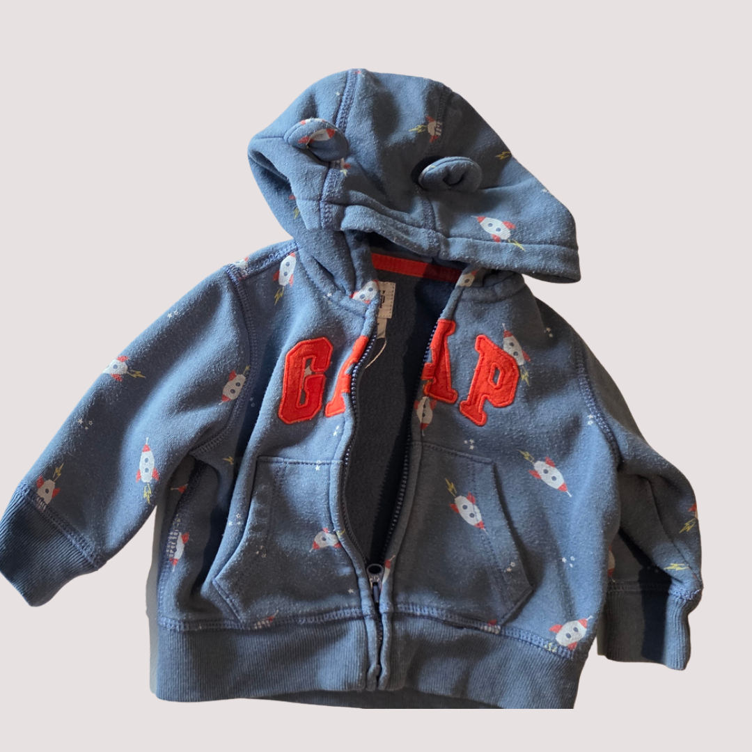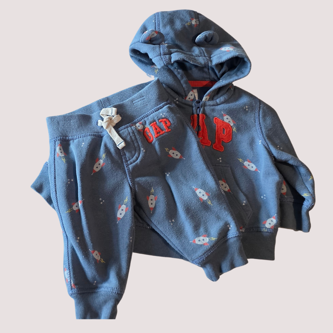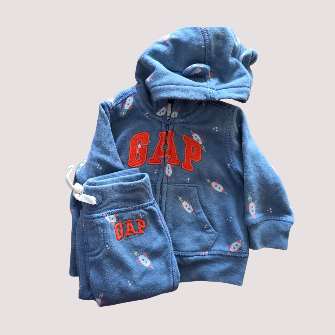 Blast off in style! 🚀 This Baby Gap tracksuit set features a fun rocket design that little adventurers will love. Made from soft, cosy cotton, it’s perfect for play, outings, or snuggly days at home.